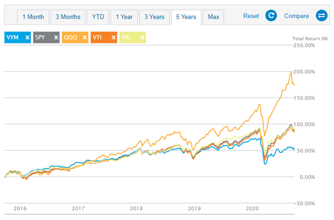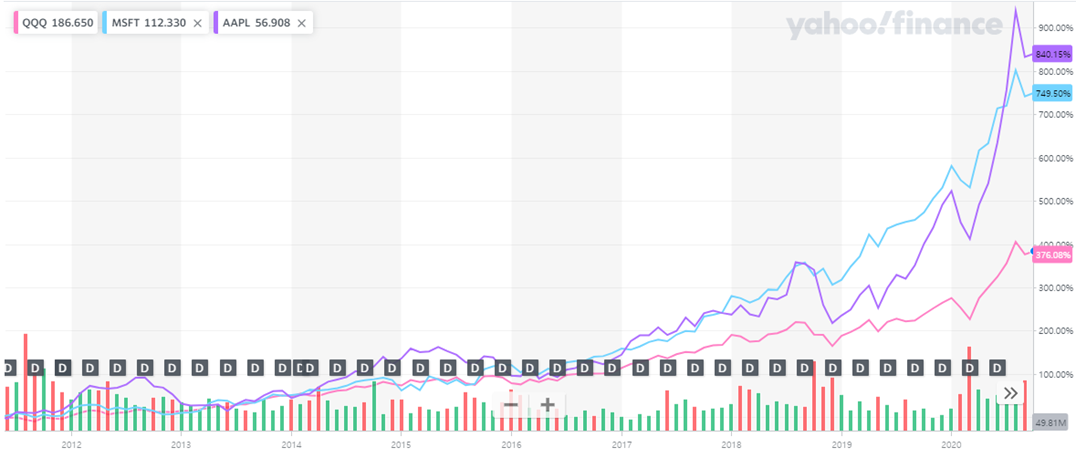 나스닥 100지수 QQQ ETF와 나스닥 대표 회사 APPLE, MICROSOFT 비교