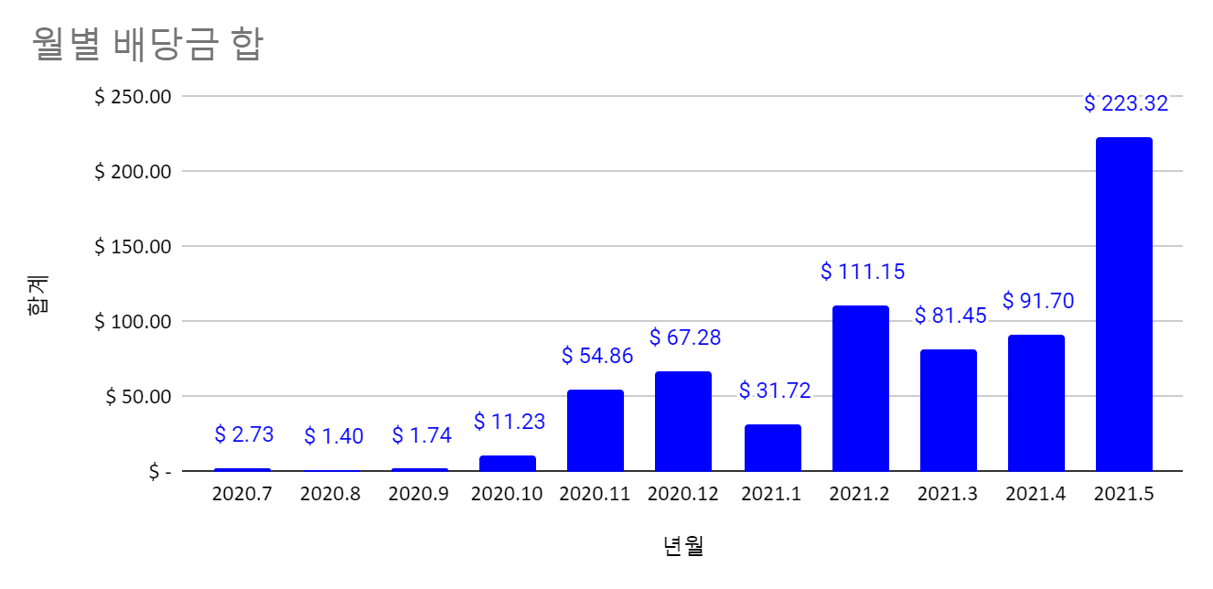 드디어 $200이상의 배당금을 받는 월이 생겼습니다.